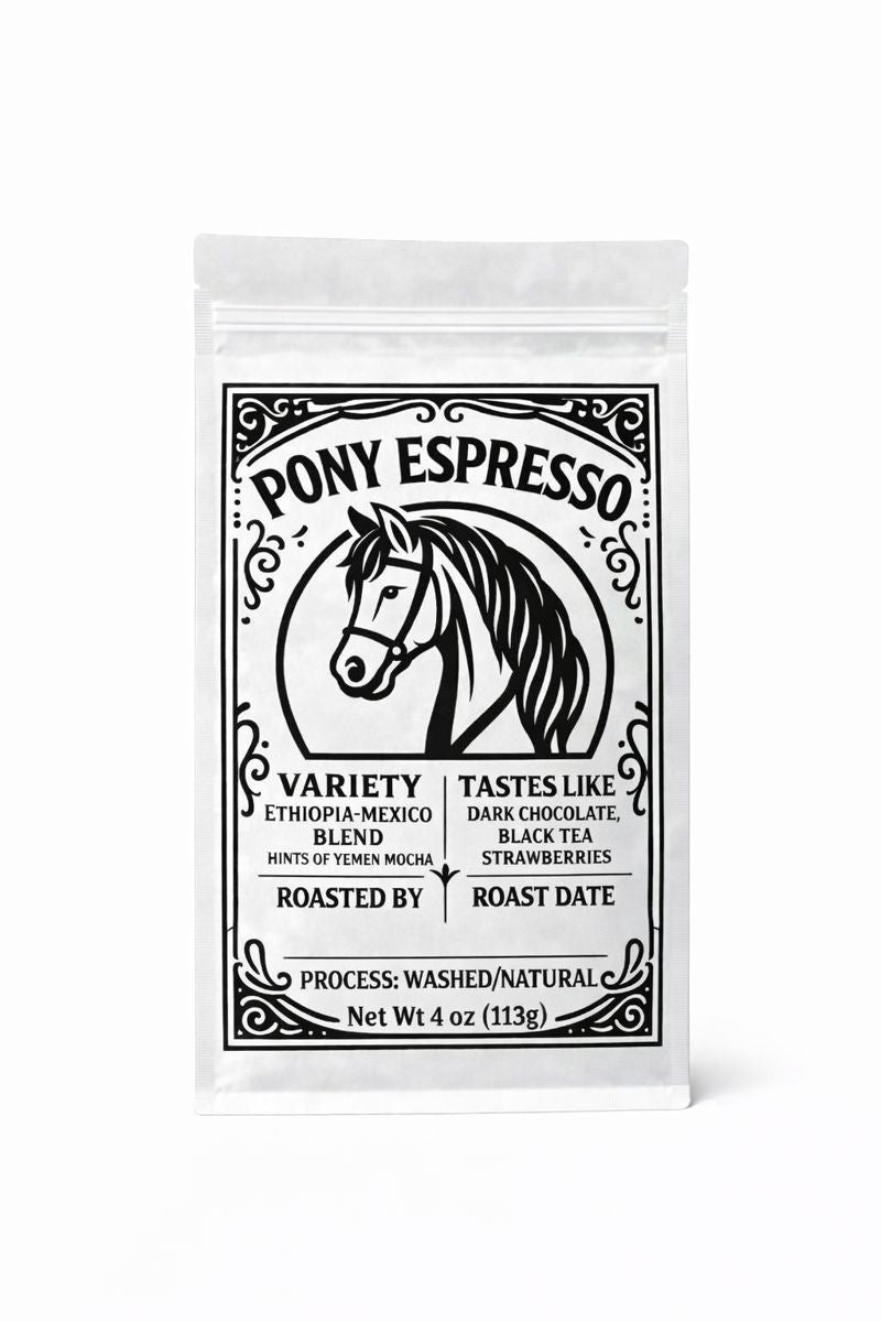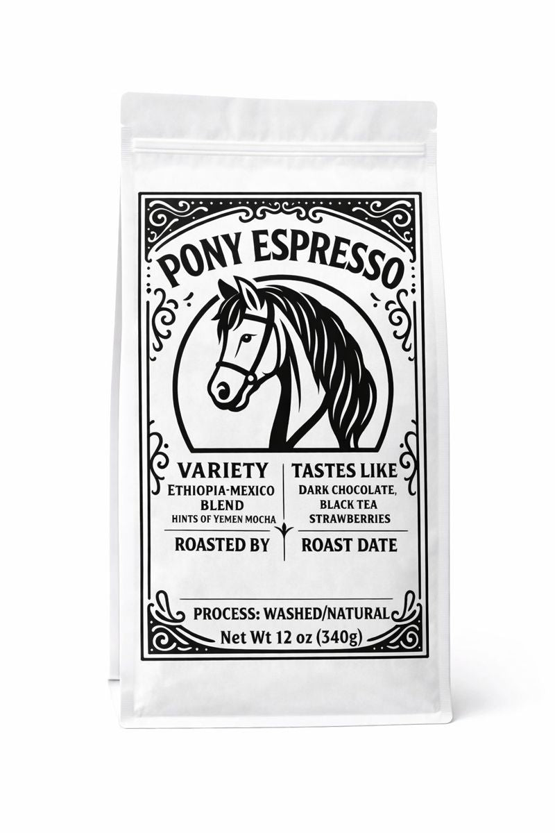 Dive into the distinctive flavors of the Pony Express blend from Ryder Roasters, a unique coffee combining Ethiopian and Mexican beans with hints of Yemen Mocca. Grown through a mix of washed and natural processes, this blend highlights the rich diversity of Heirloom, Typica, and Bourbon varieties. It tantalizes the palate with deep notes of dark chocolate, black tea, and strawberries, making each cup a celebration of the rich coffee heritage and meticulous craftsmanship from these renowned regions. Ideal for espresso or pour-over, the Pony Express blend delivers a true taste adventure in every sip.